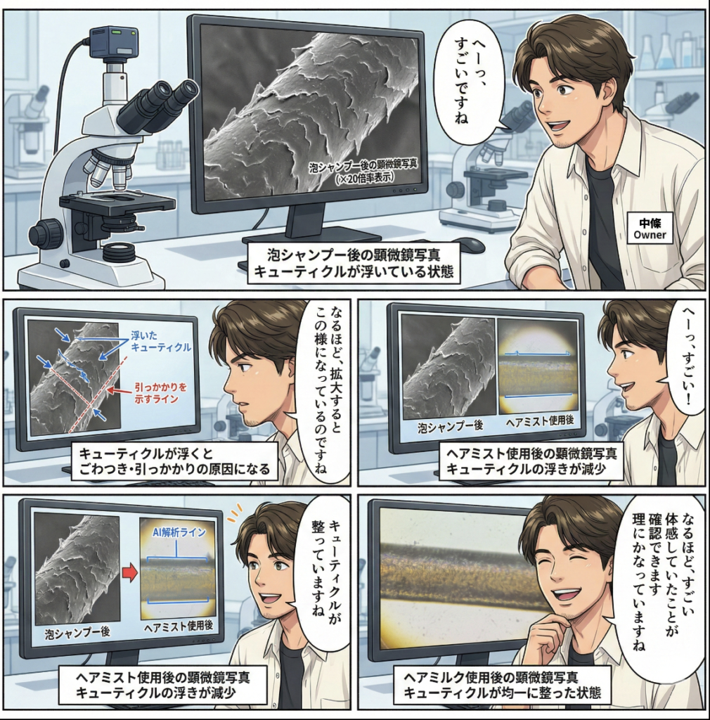 活亜興の大久保社長に、ミストとミルクを塗布した毛髪を顕微鏡で検証していただき、その状態を中條オーナーにも確認していただきました。
